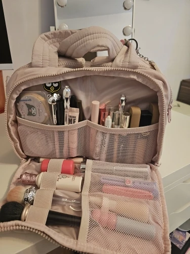 It comes with 4 thoughtfully designed compartments: 2 main sections and 2 zippered pockets, ideal for organizing brushes, bottles, and essentials.